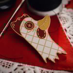 Straight from the other mothers kitchen, the button eyed ripped chicken oven mitt enamel pin